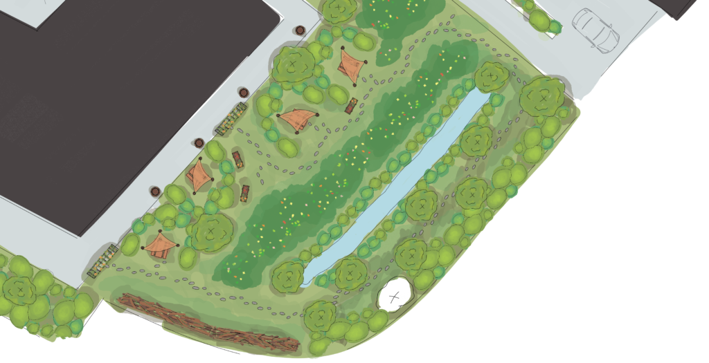 - Végétalisation du parking : en créant des noues afin d’infiltrer les eaux de pluie, apporter de l’ombre et de la fraicheur sur les véhicules.